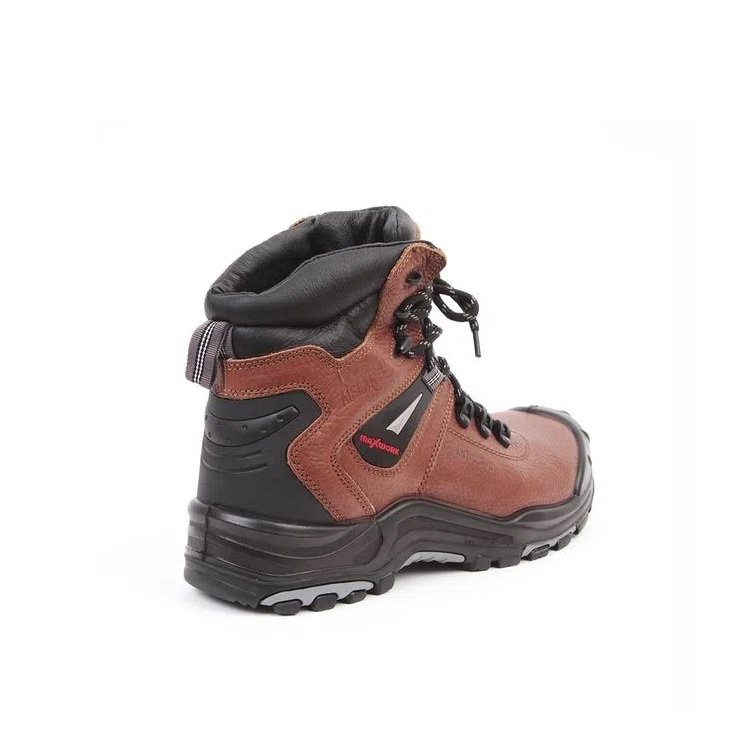 Botín de seguridad Maxwork en cuero floater y planta de PU bi densidad, antideslizantes, de altura media para trabajos en donde la comodidad es un factor relevante.