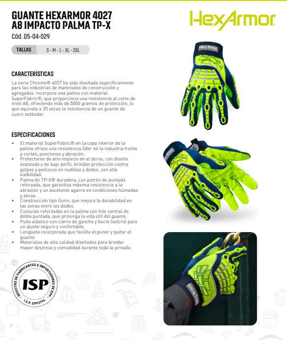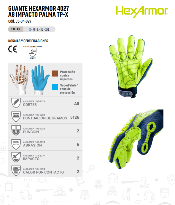 Fabricados para una amplia variedad de aplicaciones. Cada producto en esta serie fue diseñado para ajustarse a la mano con un propósito específico, como protección a impactos, parche resistente a la abrasión en la zona de los nudillos, o palma impresa en PVC, usted puede estar seguro que los HexArmor 4027 A8 Impacto Palma Tp-X van a mantener sus manos protegidas en cualquier situación de riesgo, proporcionando una motricidad fina insuperable mientras se mantiene la resistencia a corte líder en la industria.