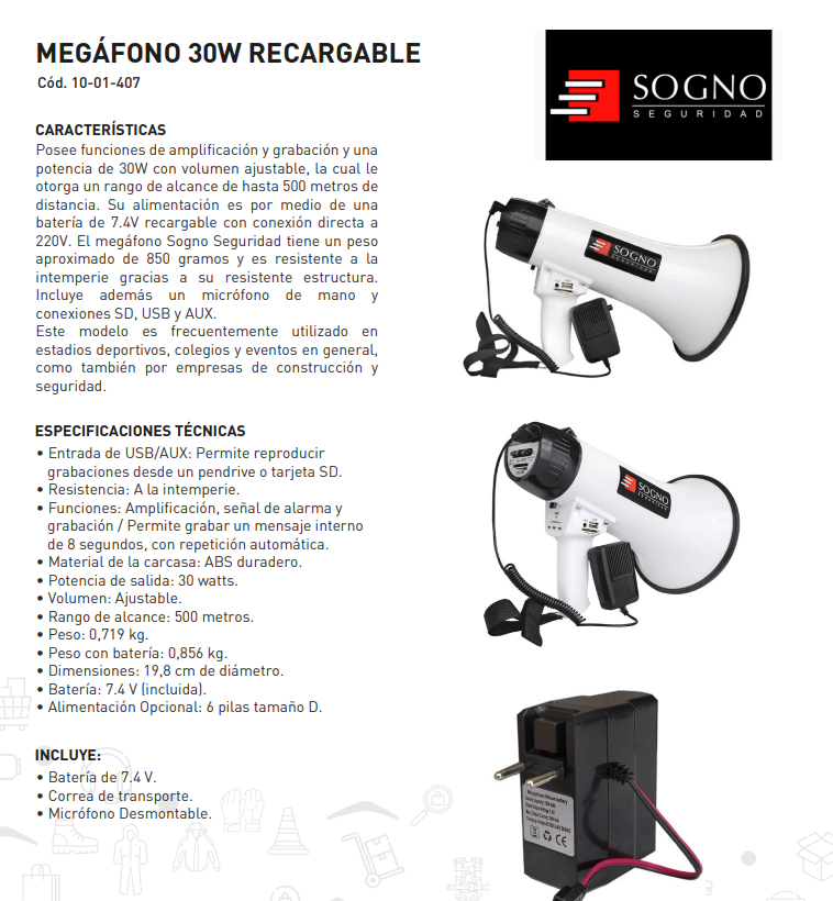 El megáfono de 30W – 500 metros de alcance, es su aliado en situaciones de emergencia, donde instrucciones urgentes deben ser indicadas a un gran número de personas. Este megáfono permitirá tener el alcance necesario para mantenerse siempre comunicado.